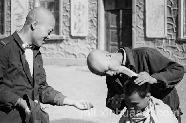 1990年4月,帕米尔高原新疆军区某部官兵在相互推光头。