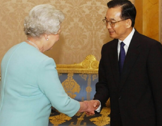 2004年5月,英国女王伊丽莎白二世在白金汉宫会见时任中国国务院总理温家宝。