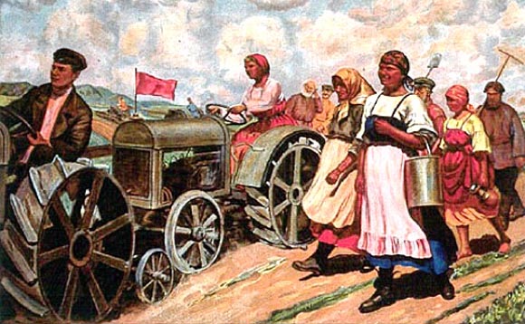 对那些希望赶上的国家来说,一种共同的求助办法是阻止外国工业品进口,直到它们新兴的工业能成长得足够强大,能够应对已抢占先机的那些国家的厂商的竞争。这当然可以有许多方法实现,无论是国家强力推动(苏联农业集体化和强制工业化)还是独裁专制(上世纪60年代的韩国),以及可能通过外国投资得到各种资金(内战后的美国)、汇率操纵或者征用没收。图为描绘苏联集体农庄的画作。