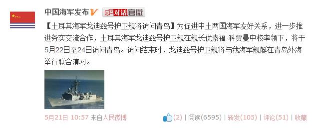 中国军网北京5月22日电 中国海军官方微博发布消息称,土耳其海军戈迪兹号护卫舰5月22日至24日将访问青岛,并与我海军舰艇在青岛外海举行联合演习。