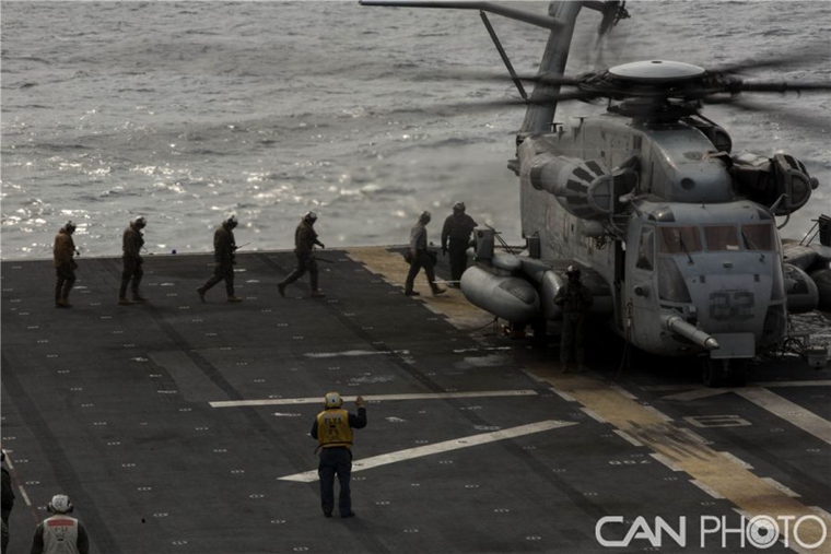 美CH-53E“超级种马”在航空母舰上进行甲板两栖运动