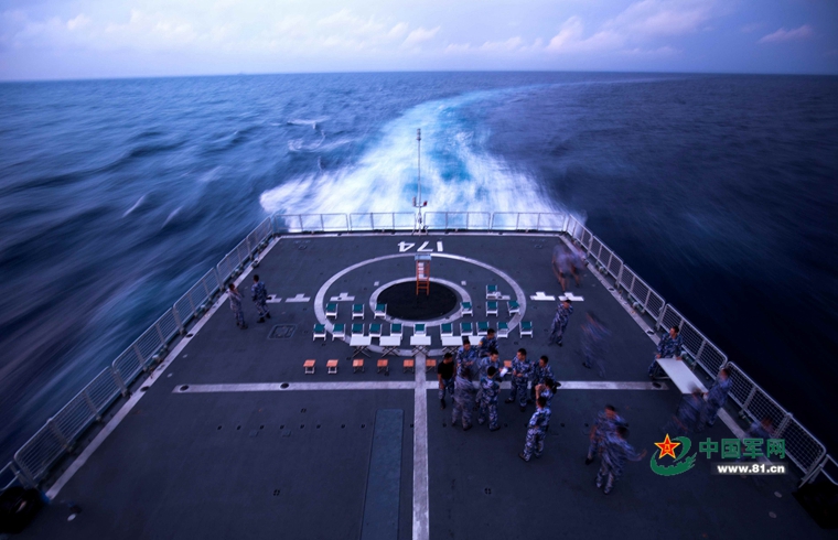 19:00,战舰在浪花间疾驰,渐渐暗下来的甲板上,晚会各项准备工作也加快了速度。