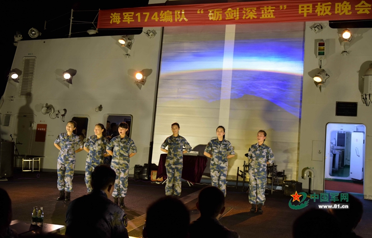 174舰的美丽女兵在表演歌舞,她们大概是当晚最靓丽的风景。