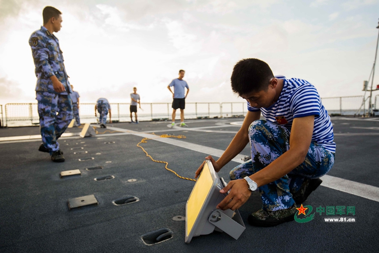 17:30-18:00,在腾出空间的起降平台上,晚会准备继续进行,灯光架设必不可少。