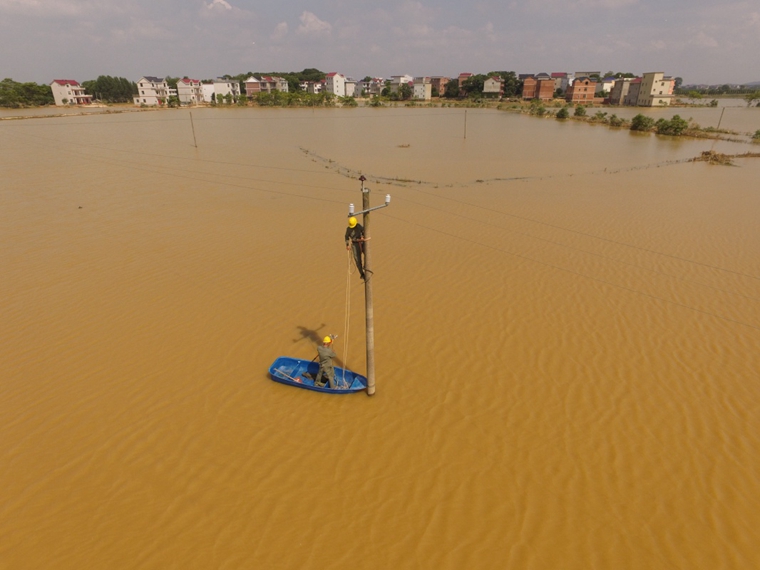 在鄱阳县古县渡镇张家坽村,共产党员服务队的队员们划着小船来到被水淹没的农田中央的一根电线杆处检查。