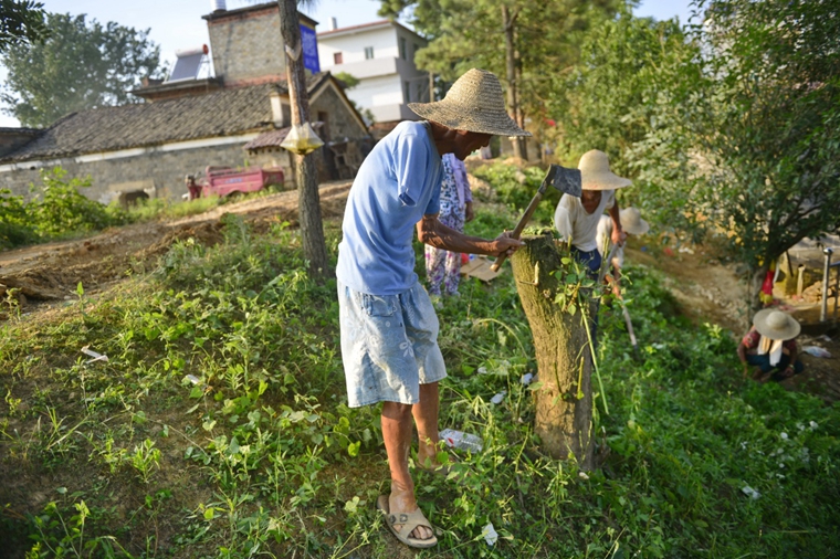 鄱阳向阳圩上,70岁的独臂老人李观友和村民们一起帮忙清除杂草、拓宽路面(6月23日摄)。