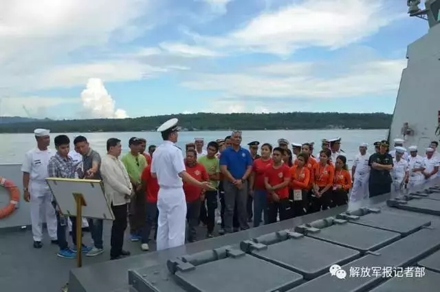 驻菲使馆工作人员、中资机构、华人华侨和菲律宾官兵代表参观导弹护卫舰荆州舰。记者 严贵旺 摄
