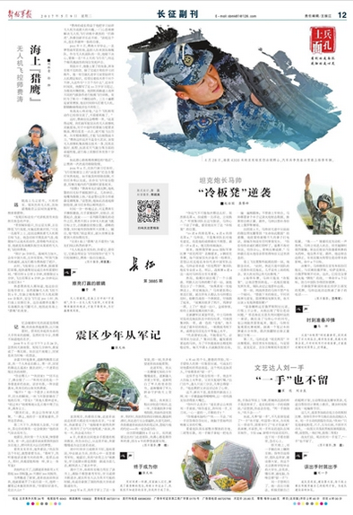 今天的长征副刊版的《士兵面孔》专栏,不仅给您带来了无人机飞控师费涛的故事,还有坦克炮长马帅、震区少年和文艺达人刘一手的故事。请看今日出版的《解放军报》的报道: