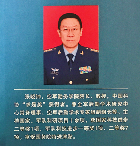 张晓钟,空军勤务学院院长、教授,中国科协“求是奖”获得者。兼全军后勤学术研究中心常务理事、空军后勤学术专家组副组长等。主持国家、军队科研项目十余项,获国家科技进步二等奖1项,军队科技进步一等奖1项、二等奖7项。享受国务院特殊津贴。