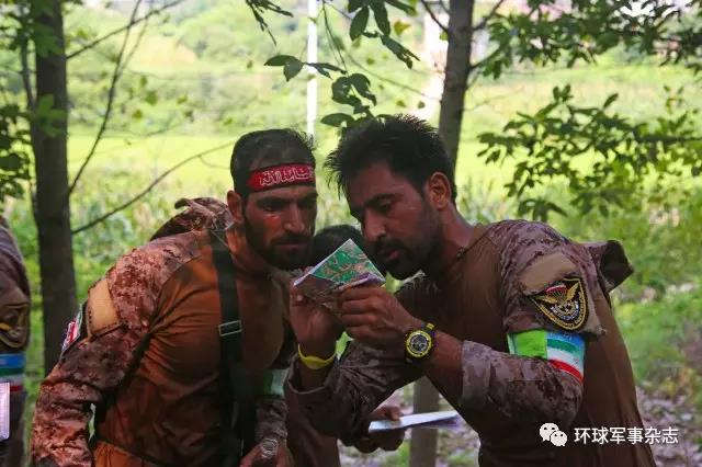 在“越障与射击”比赛现场,一名伊朗队员膝盖绑着纱布,依然奋力跨越障碍。