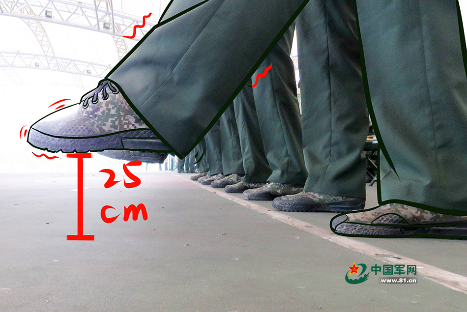 《中国人民解放军队列条令》第四章第二十一条“腿要绷直,脚尖下压,脚掌与地面平行,离地面约25厘米”。