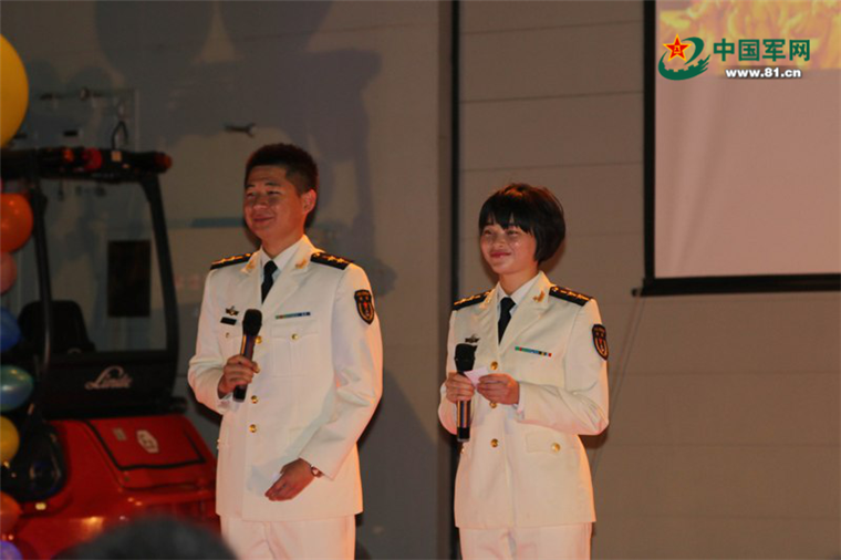 林丽霞(右一)与彭勃峰在主持甲板晚会。赵德衡 摄