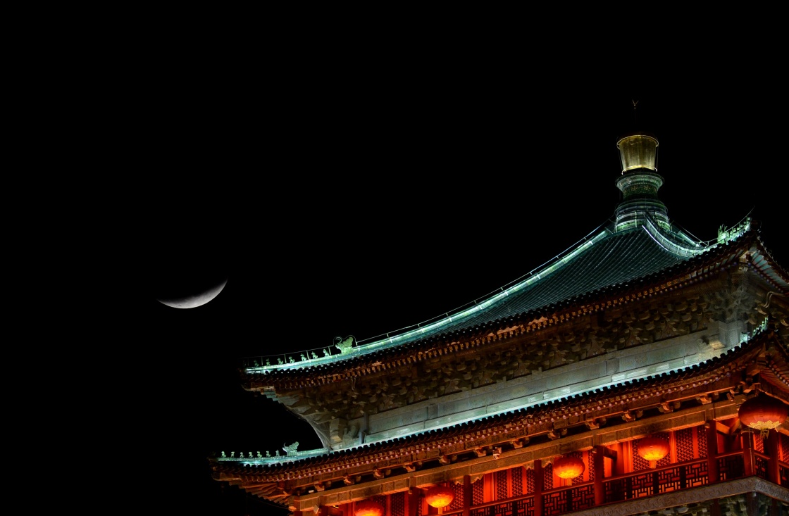 这是1月31日在陕西省西安市钟楼拍摄的月亮。新华社记者 李一博 摄