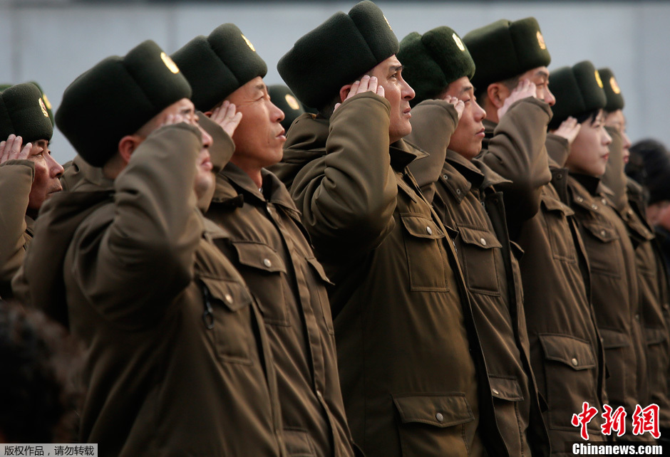 2月16日,朝鲜举行系列活动庆祝前最高领导人金正日诞辰日(即朝鲜光明星节)。图为朝鲜平壤万寿台,朝鲜军人向金日成和金正日铜像致敬。