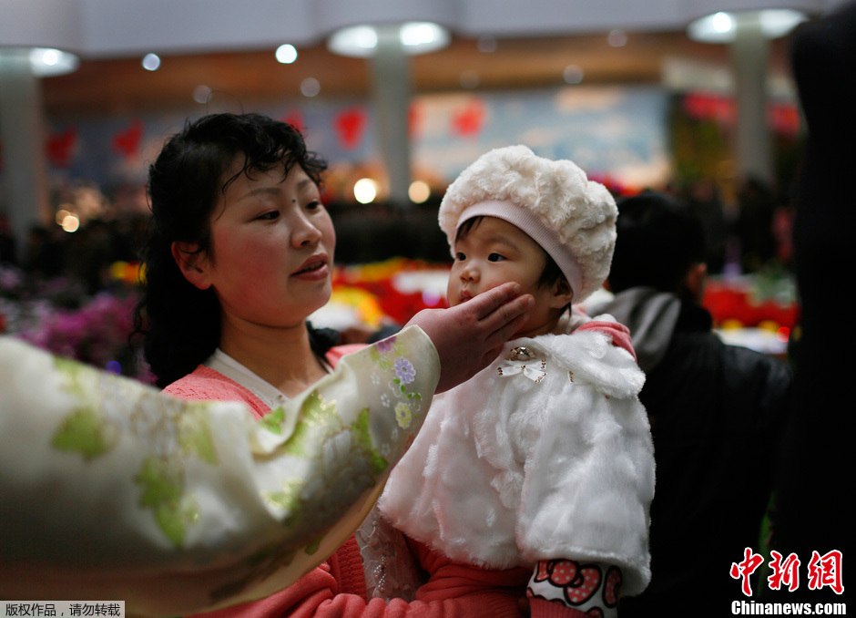 2月16日,朝鲜举行系列活动庆祝前最高领导人金正日诞辰日(即朝鲜光明星节)。图为朝鲜平壤举行的“金正日花节”展览上,一名小孩盛装参观。