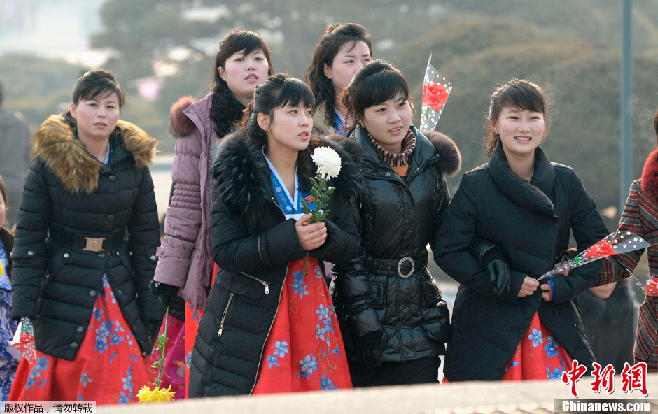 2月16日,朝鲜举行系列活动庆祝前最高领导人金正日诞辰日(即朝鲜光明星节)。图为朝鲜平壤万寿台,民众手持鲜花前往参观金日成和金正日铜像。