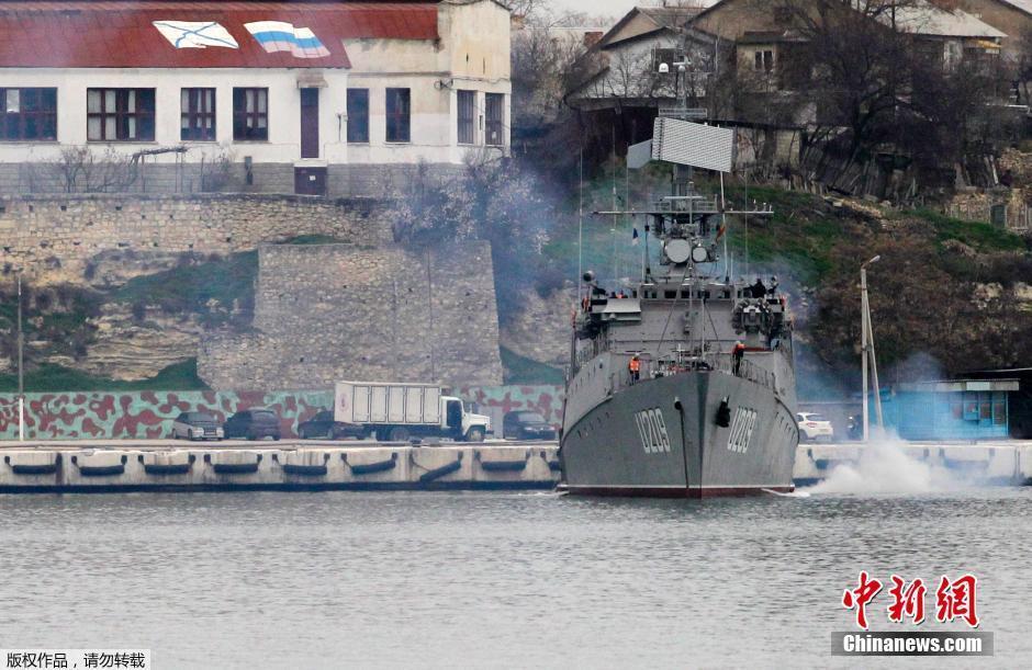 当地时间2014年3月3日,乌克兰塞瓦斯托波尔,人们看着俄罗斯海军军舰驶入港口。乌克兰防长表示俄罗斯强行占领乌克兰克里米亚战略基地,并要求船上人员投降。