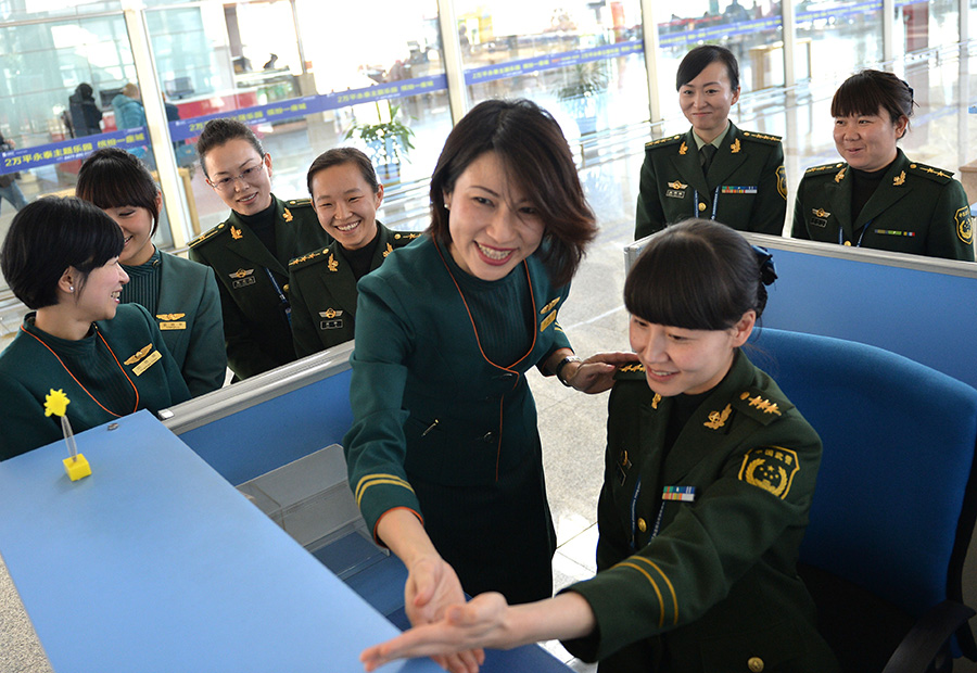 当日,呼和浩特市边防检查站的女检查员们将台北直飞呼和浩特的BR728次航班的空姐们邀请到边检站,向她们学习基本的礼仪知识,以提高自身服务水平;并为台湾空姐送上蒙古族特色的小礼物,同庆“三八妇女节”。新华社记者任军川摄