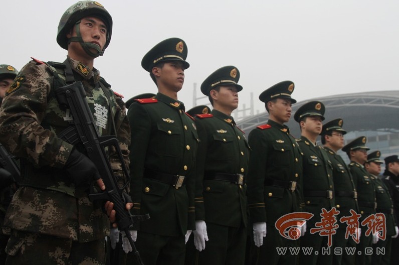 武警队员严阵以待,3月3日上午,西安市雁塔区举行全国“两会”安保暨反暴恐警民联手群防群治启动仪式。图片来源:华商网