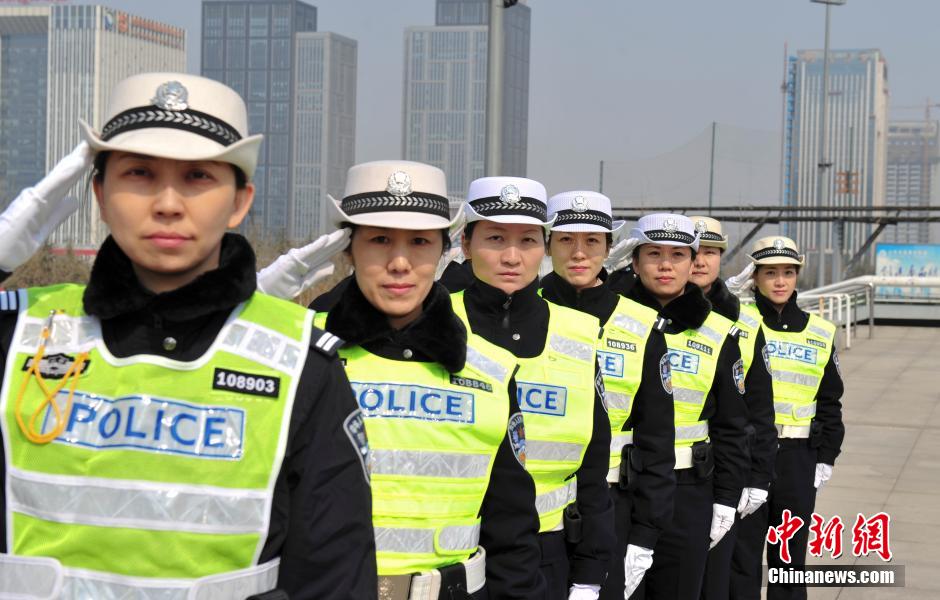 3月13日,在“国际警察日”来临之际,济南历下交通警察大队民警集体亮相济南奥体中心开展岗位练兵比武。女交警标准的执勤手势,吸引不少民众围观。图为女交警展示执勤手势。中新社发 张勇 摄