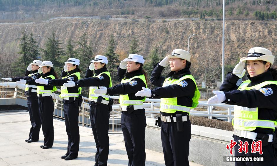 3月13日,在“国际警察日”来临之际,济南历下交通警察大队民警集体亮相济南奥体中心开展岗位练兵比武。女交警标准的执勤手势,吸引不少民众围观。图为女交警展示执勤手势。中新社发 张勇 摄