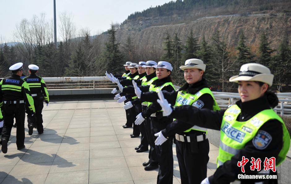 3月13日,在“国际警察日”来临之际,济南历下交通警察大队民警集体亮相济南奥体中心开展岗位练兵比武。女交警标准的执勤手势,吸引不少民众围观。图为女交警展示执勤手势。中新社发 张勇 摄