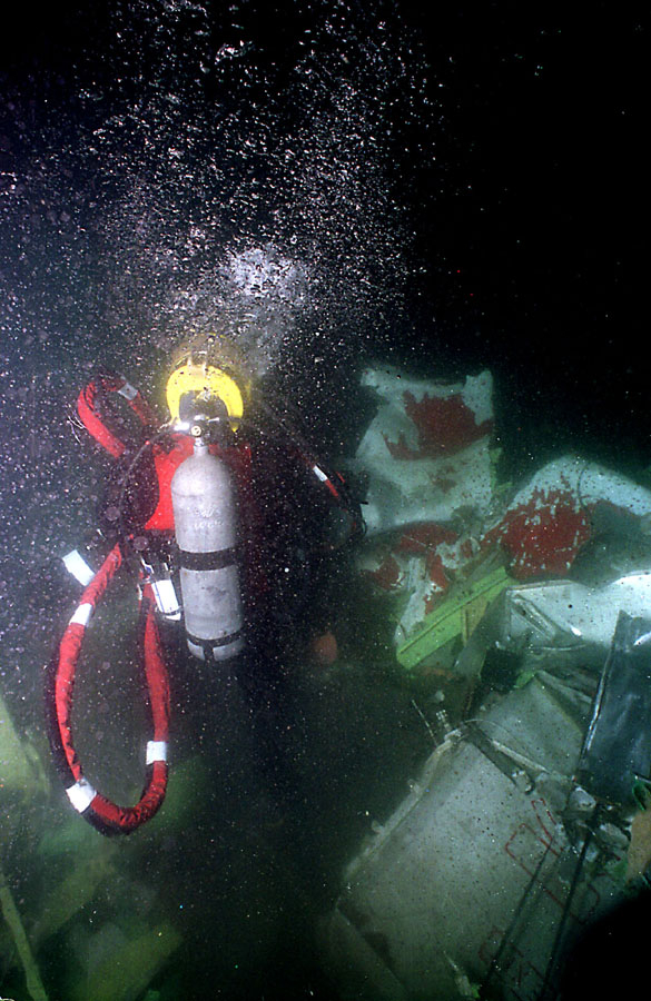 美国海军潜水员在120英尺深的海底行走,找寻失事的环球航空800号航班残骸。