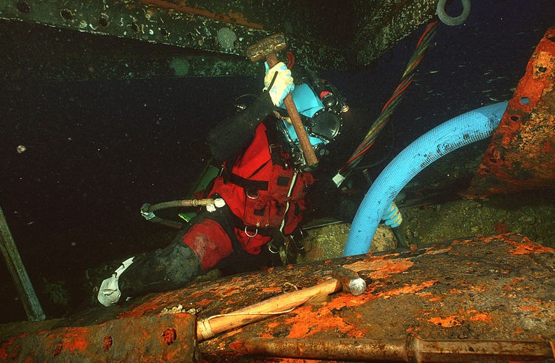 2001年7月3日,美国海军潜水员用锤子和凿甲板卸下莫尼特号战舰残骸上钢甲板。海军潜水员和考古学家连续工作打捞沉船的引擎和零件,这些将在纽波特纽斯的水手博物馆展出。1862年12月,该船因风暴沉没于北卡罗来纳州附近海域。