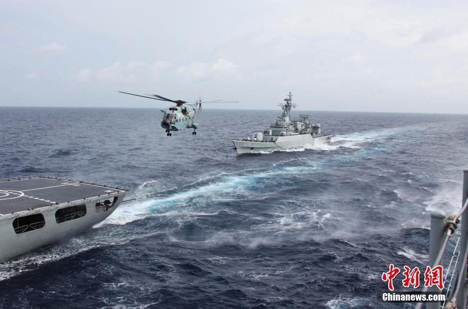 直8穿梭在千岛湖舰和井冈山舰之间直接转运物资,绵阳舰尾随接受燃料补给 中新社发 代宗锋 摄