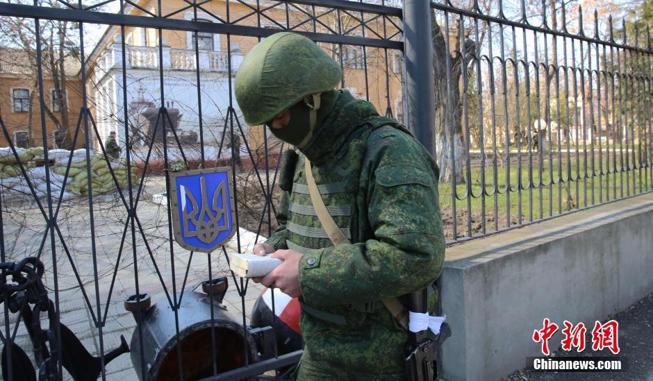 3月18日,一名身份不明的武装人员在位于克里米亚首府辛菲罗波尔市中心的乌克兰军营外看书。中新社发 王修君 摄