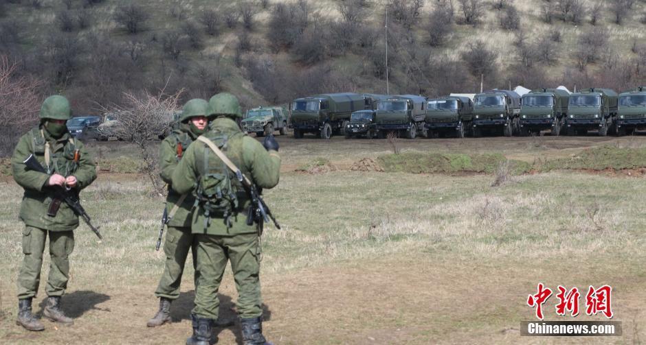 3月18日,几名身份不明的武装人员在克里米亚首府辛菲罗波尔郊外25公里处的乌克兰军事基地外站岗,远处是大量没有标示的军用车辆。中新社发 王修君 摄