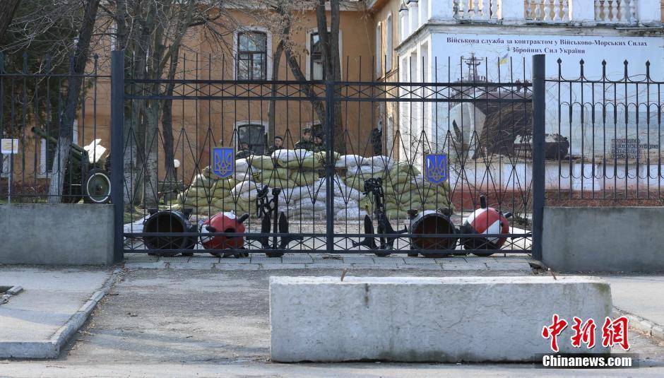 3月18日,位于克里米亚首府辛菲罗波尔市中心的乌克兰军营防守严密。正门后有铁丝网、铁锚等,再后有沙袋掩体。中新社发 王修君 摄