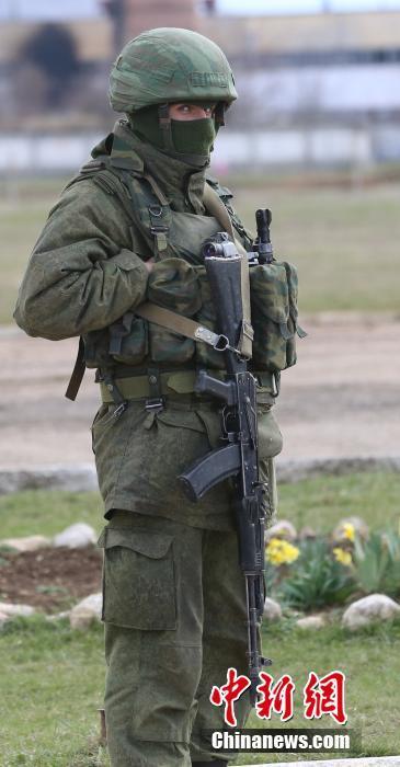 3月18日,一名身份不明的武装人员在克里米亚首府辛菲罗波尔郊外25公里处的乌克兰军事基地外站岗。中新社发 王修君 摄