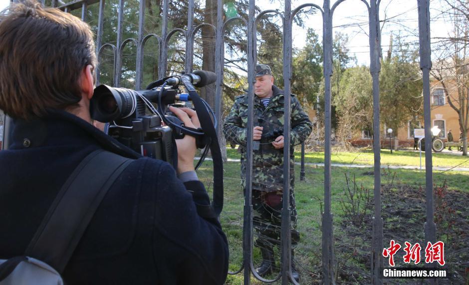 3月18日,一位克里米亚的乌克兰军营指挥官隔着铁栅栏围墙和内部设置的铁丝网对媒体表示,该部队目前仍然效忠基辅。中新社发 王修君 摄