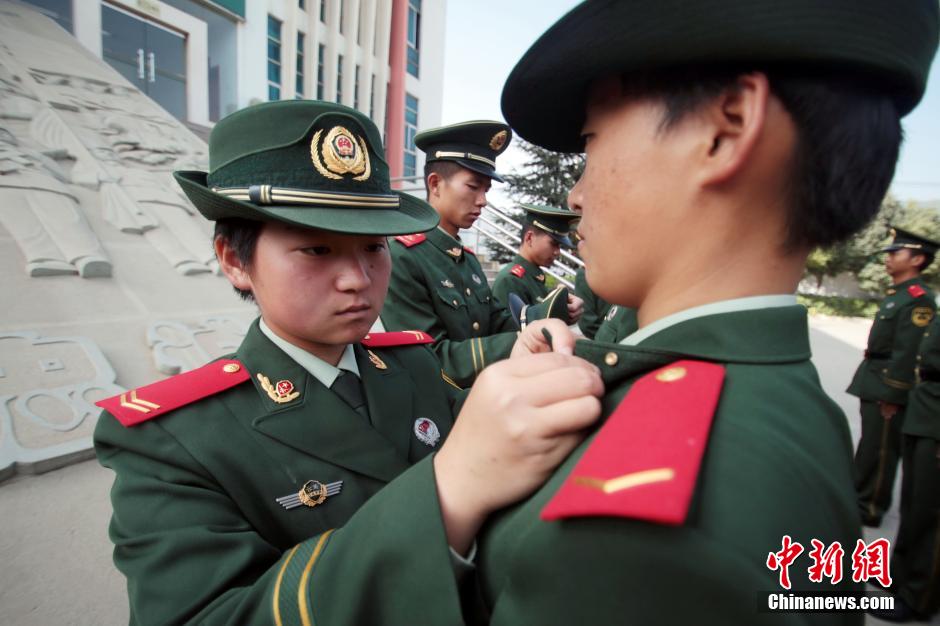 王悠在为完成三个月新兵训练的女兵佩戴警衔。(摄于2013年11月14日)出生在湖北荆门的90后女生王悠2012年从湖北荆楚理工学院医学院毕业后,选择了参军入伍,想在部队当一名军医。但来到武警云南总队司令部成为一名话务员的现实和“三点一线”的军营生活,让王悠感觉和她上军校、当军医的理想遥遥无期。经过干部、战友的鼓励让王悠重拾信心,去年年底,王悠被总队评为“优秀士兵”。目前,王悠正在紧张备战一年一度的军校考试,朝着自己的目标迈进。