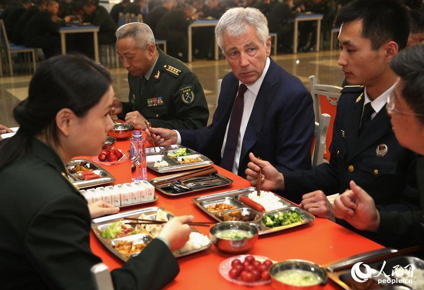 4月9日,北京昌平,美国国防部长哈格尔9日上午参观总装备部装备学院昌平士官学校,与学员共进午餐,了解他们学习训练情况。哈格尔点了宫爆鸡丁、西兰花和水饺。