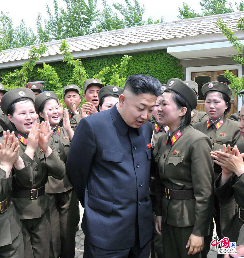 朝鲜领导人金正恩(Kim Jong-un)日前视察朝鲜人民军部队,被激动的女兵包围,脸上笑容满面。