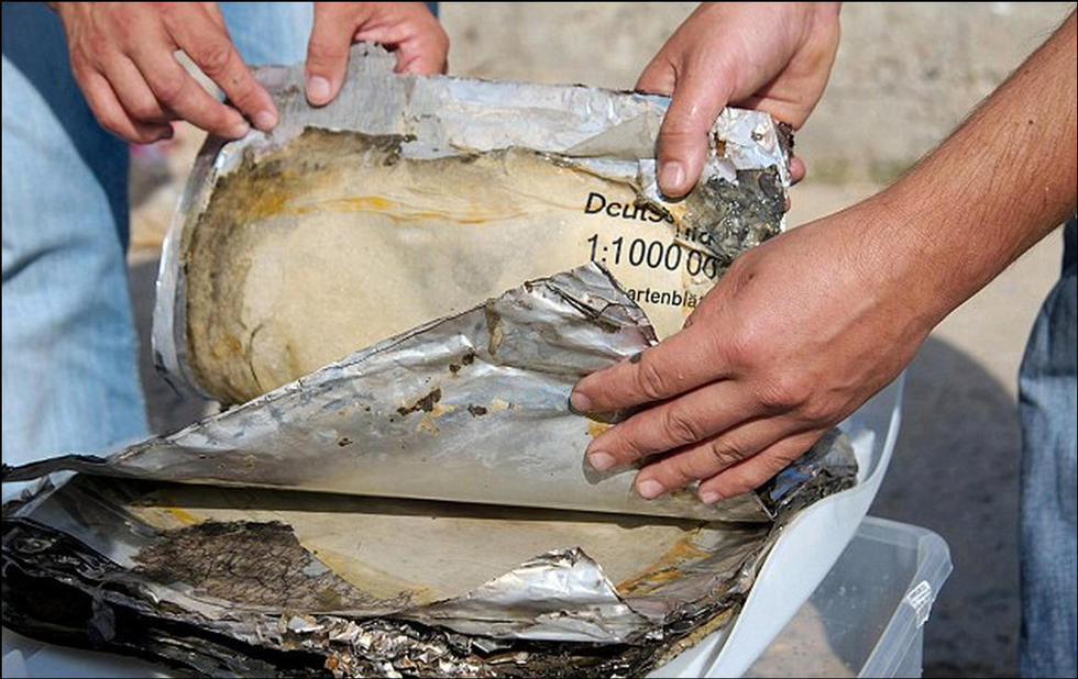 图为在飞机的驾驶员座舱内发现的地图。在地图的每一页间还夹放着铝箔片,以防发生火灾时地图被烧毁。
