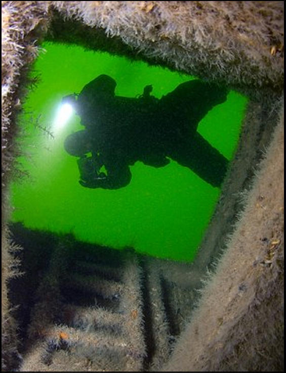 图为一名潜水员正在对战机残骸进行考察。