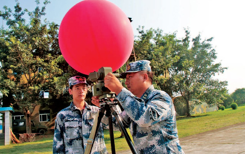 气象台两名战士正在放飞探空气球。放气球看着一点都不费力气,但却是个累人的活儿。气球放飞后,要跟踪记录好几个小时的气象数据,直到气球飞到几万米的高空后爆炸。