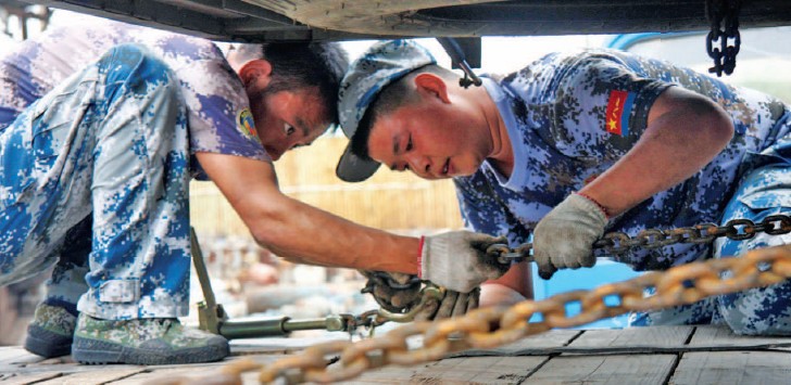 这是一次部队开拔前的准备,两名战士协同对车辆实施固定。