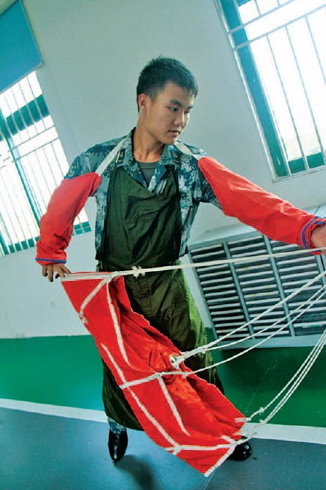 航材股救生装具室战士覃瑶正在包一具减速伞。为了防止包伞过程中有异物落入伞衣内,他用废旧的伞衣做了个围裙和袖套。看不出来,还挺合身!