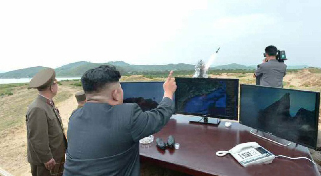 当地时间2014年8月15日,据朝中社报道,朝鲜最高领导人金正恩日前指导朝鲜人民军发射战术火箭。图片来源:东方IC
