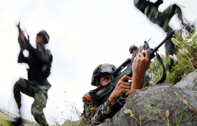 8月14日,武警广西总队桂林支队“眼镜蛇退突击队”在野外成战斗队形进攻。