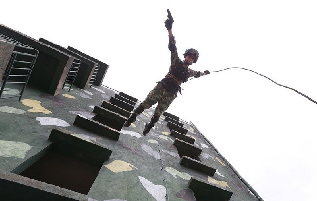 8月14日,武警广西总队桂林支队“眼镜蛇退突击队”的一名队员持枪从楼房上飞身跃下。