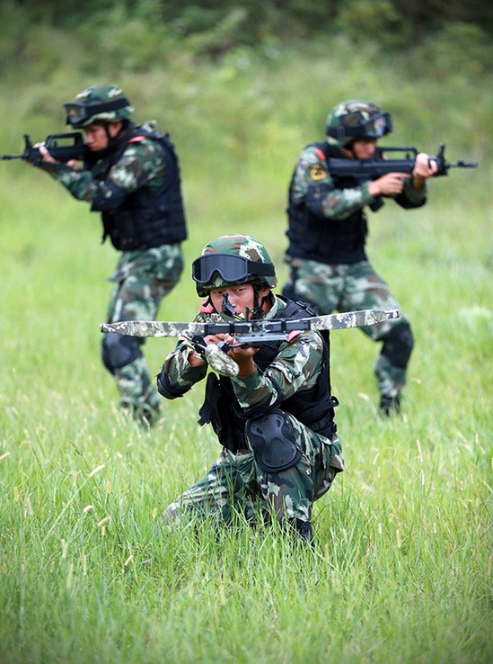 8月14日,武警广西总队桂林支队“眼镜蛇退突击队”队员(前)在野外手持弓弩瞄准。