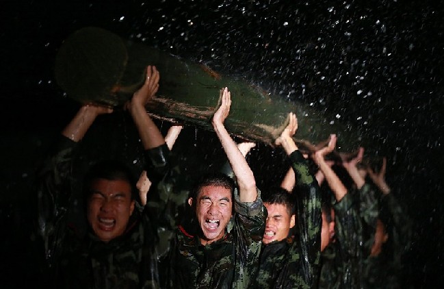 8月13日晚,武警广西总队桂林支队“眼镜蛇退突击队”在野外进行扛圆木训练。