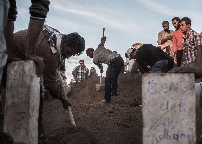 据《每日邮报》报道,当地时间2014年10月9日,3名库尔德战士在抵抗叙利亚极端武装的战斗中牺牲,悲痛的民众为3名勇士举行葬礼。图为一个孩子目送战士的遗体下葬。