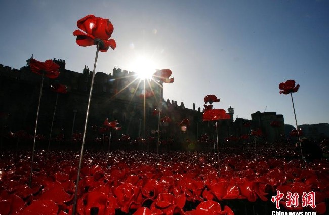 当地时间2014年10月9日,英国伦敦,为了纪念第一次世界大战,英国在伦敦塔的城壕中“种植”陶瓷罂粟花,用每一朵花纪念一位一战中的逝者。