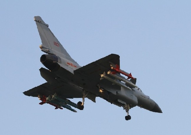 试飞中的歼-10B战斗机,挂载了多枚空空导弹训练弹。